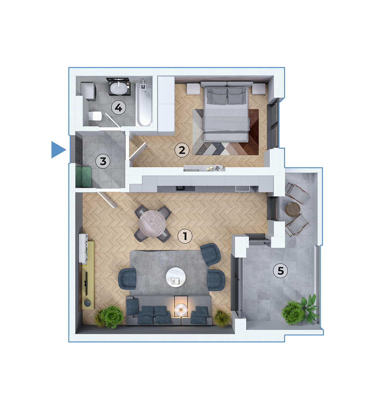 Dormitorul/biroul de 15.29 mp oferă flexibilitate, putând fi folosit ca spațiu de odihnă sau de lucru. Holul de 3.69 mp asigură o trecere fluidă între diferitele zone ale apartamentului. Baia de 4.91 mp este modernă și funcțională, optimizând spațiul disponibil.