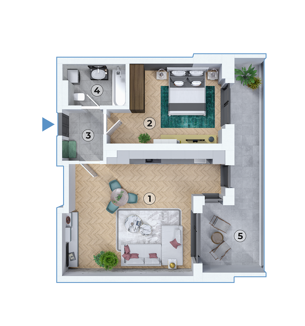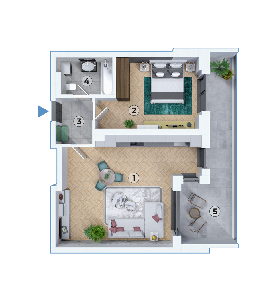Dormitorul/biroul de 15.19 mp oferă flexibilitate și intimitate, fiind potrivit atât pentru odihnă, cât și pentru muncă sau studiu. Holul de 3.78 mp asigură o trecere fluidă între camere. Baia de 4.72 mp este proiectată pentru a maximiza spațiul și funcționalitatea.