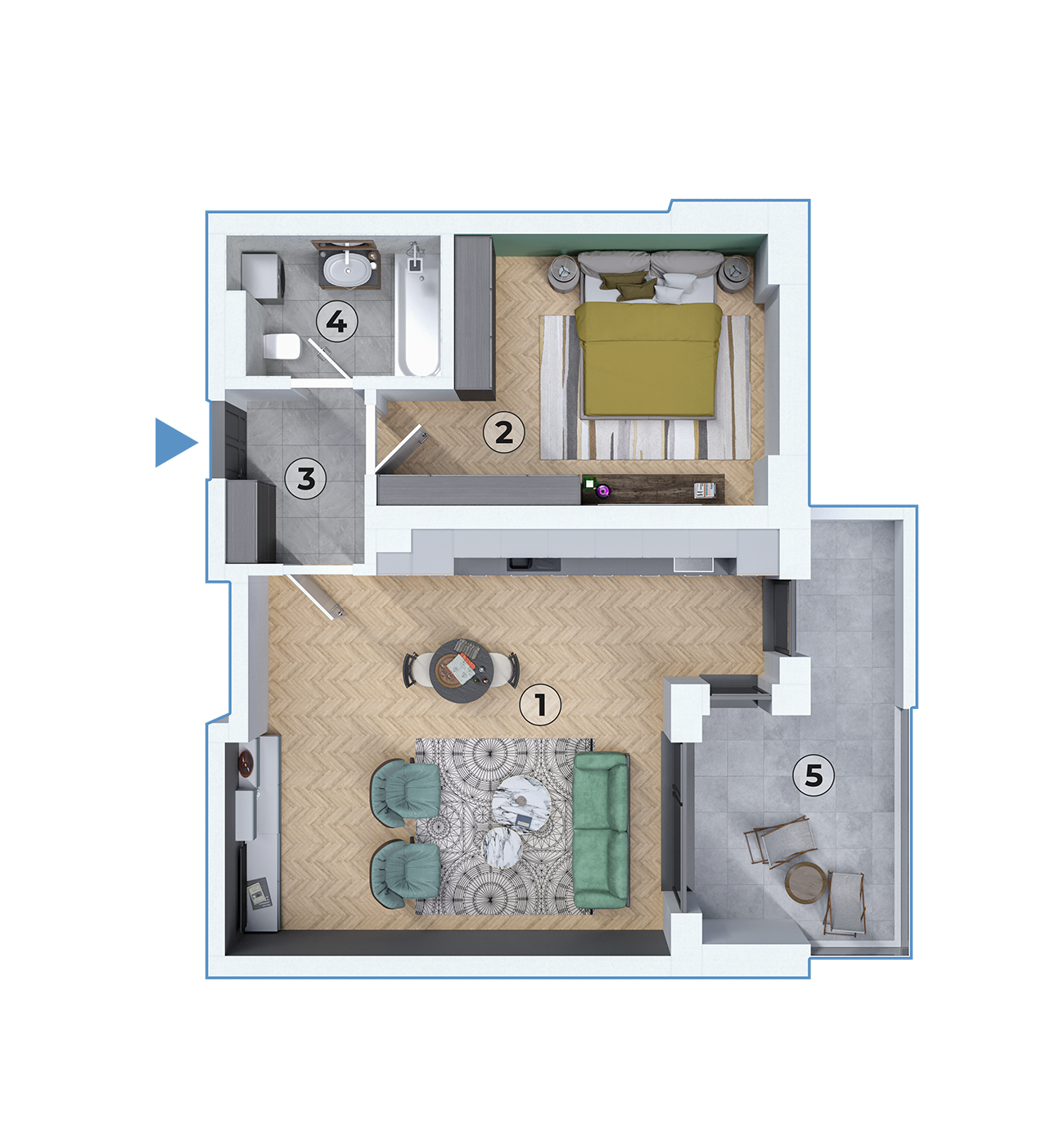 Dormitorul/biroul de 16.23 mp asigură flexibilitate și intimitate, fiind potrivit atât pentru odihnă, cât și pentru activități de lucru sau studiu. Holul de 4.05 mp facilitează accesul între camere. Baia de 4.91 mp este modernă și eficient amenajată.