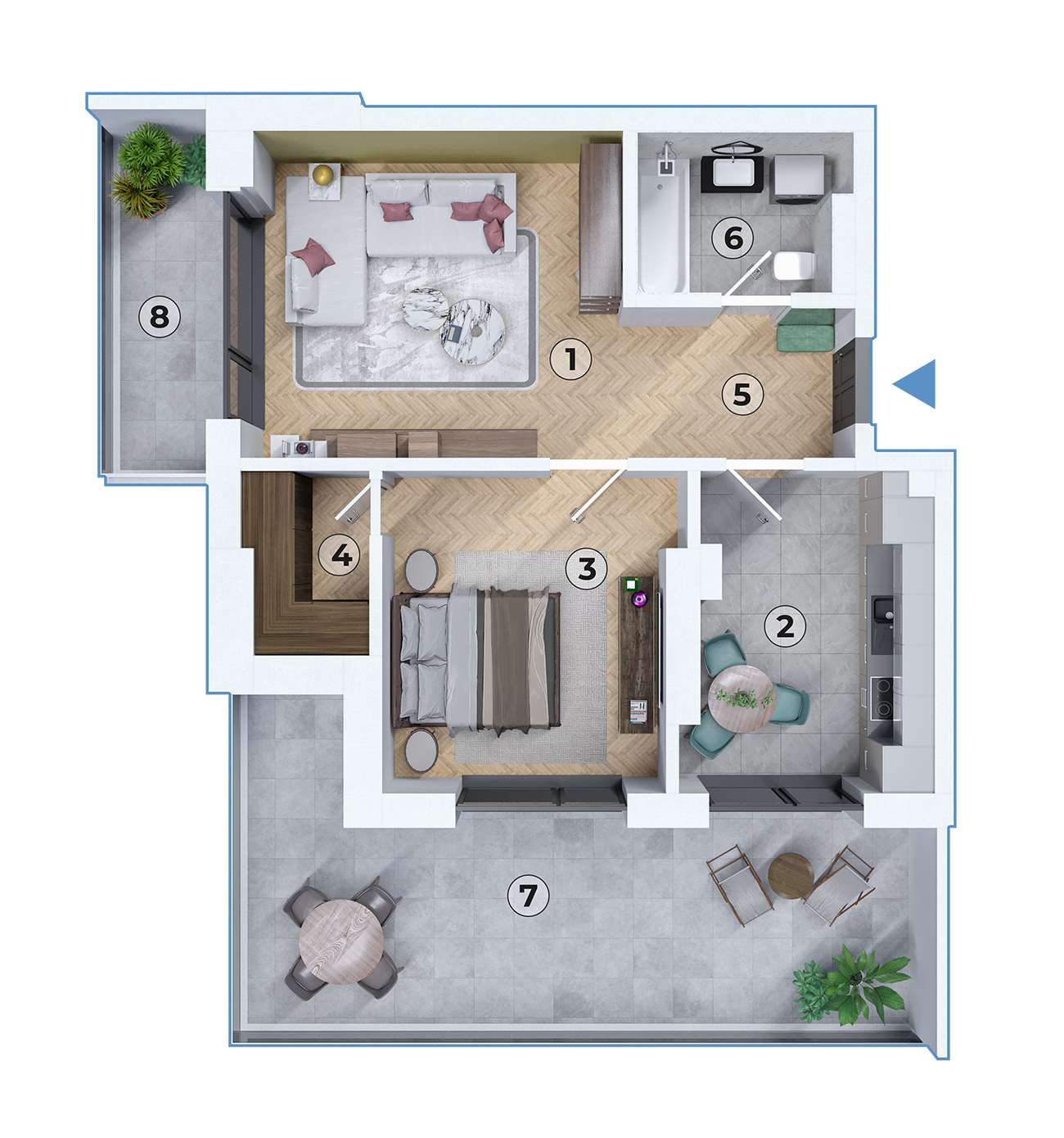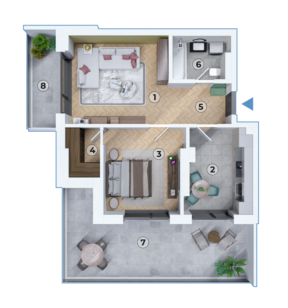 Atuurile majore sunt terasa de 22.85 mp și balconul de 5.74 mp, care extind considerabil zona de locuit în exterior, oferind locuri excelente pentru relaxare, distracție sau chiar grădinărit.