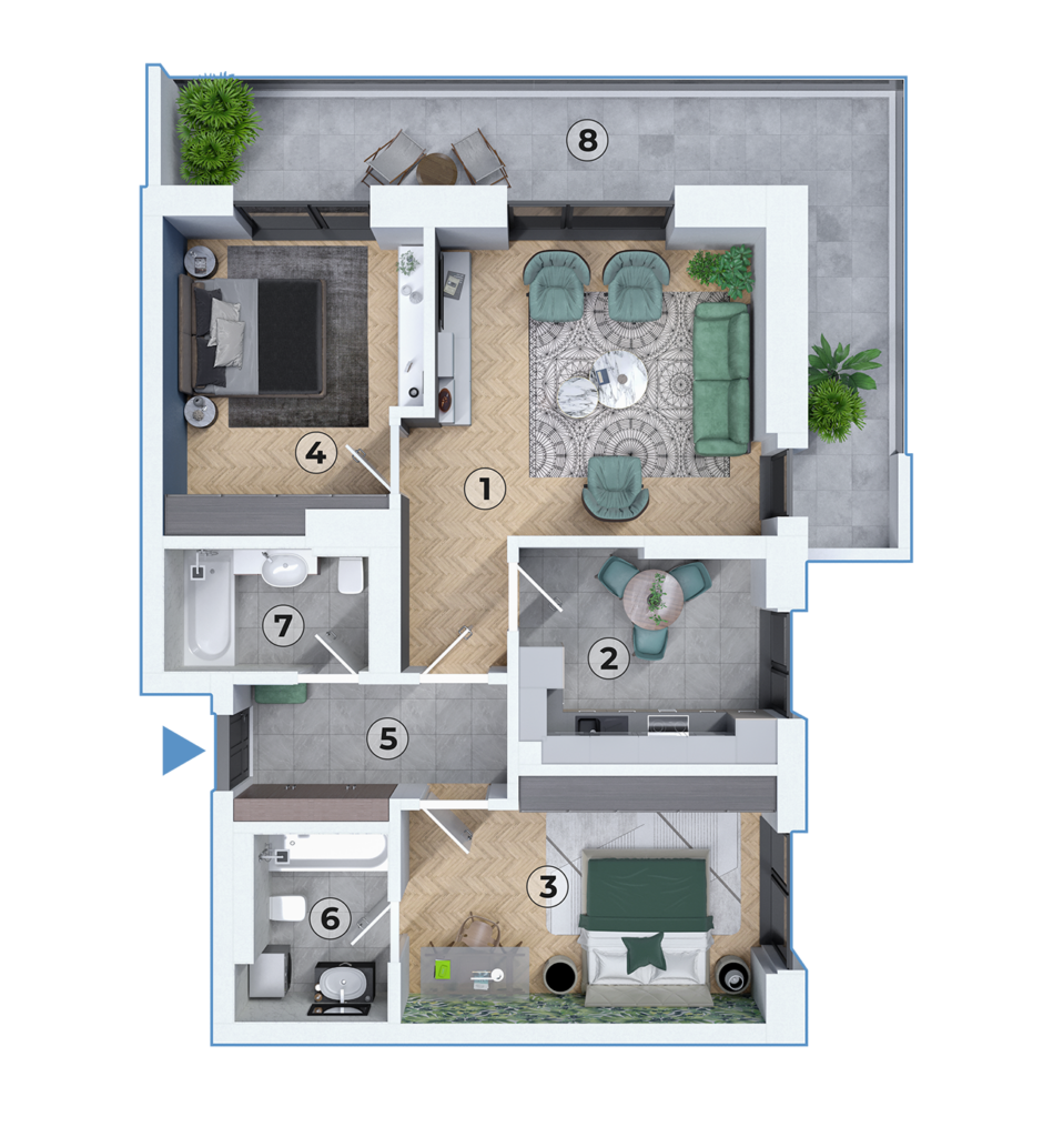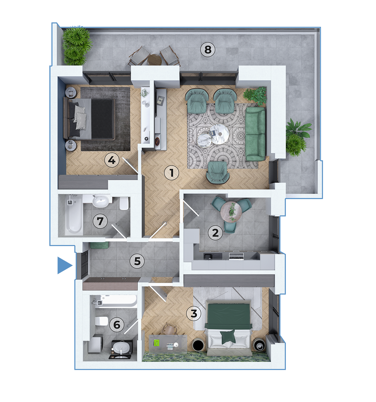 Design refined și spațiu generos: Acest apartament cu 3 camere, tip B, este un exemplu de utilizare inteligentă a spațiului. Designul său contemporan și spațiile bine gândite creează un mediu de locuit confortabil și stilat. Balconul spațios adaugă o dimensiune suplimentară la apartament, permițând locatarilor să se bucure de exterior și de vederi panoramice. Ideal pentru familii sau profesioniști, acest apartament oferă un echilibru perfect între funcționalitate, confort și estetică, fiind adaptat pentru un stil de viață urban modern.