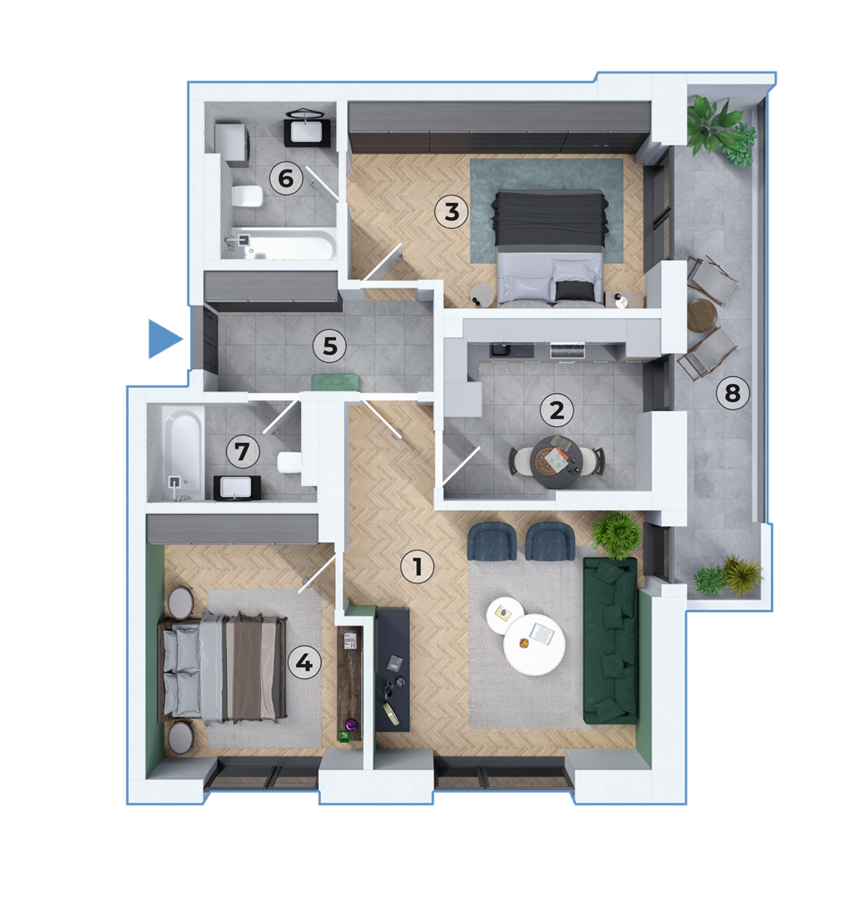 Caracteristici generale: Acest apartament cu 3 camere, tip C, este proiectat pentru a oferi un echilibru ideal între confort și eleganță. Living-ul de 21.27 mp este spațios și luminos, creând un mediu perfect pentru relaxare și activități de familie. Bucătăria de 9.16 mp este eficientă și bine echipată, optimizată pentru a maximiza funcționalitatea.