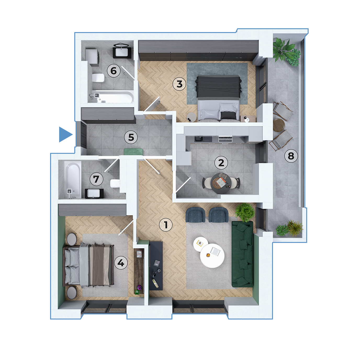Design modern și funcționalitate: Acest apartament cu 3 camere, tip C, îmbină un design modern cu o distribuție eficientă a spațiului. Living-ul generos, împreună cu dormitorul/biroul versatil și balconul confortabil, asigură un mediu de locuit plăcut și practic. Ideal pentru familii sau cupluri care caută un echilibru între spațiu personal și zone comune, acest apartament oferă un cadru de locuit contemporan, confortabil și adaptabil nevoilor moderne de locuire.