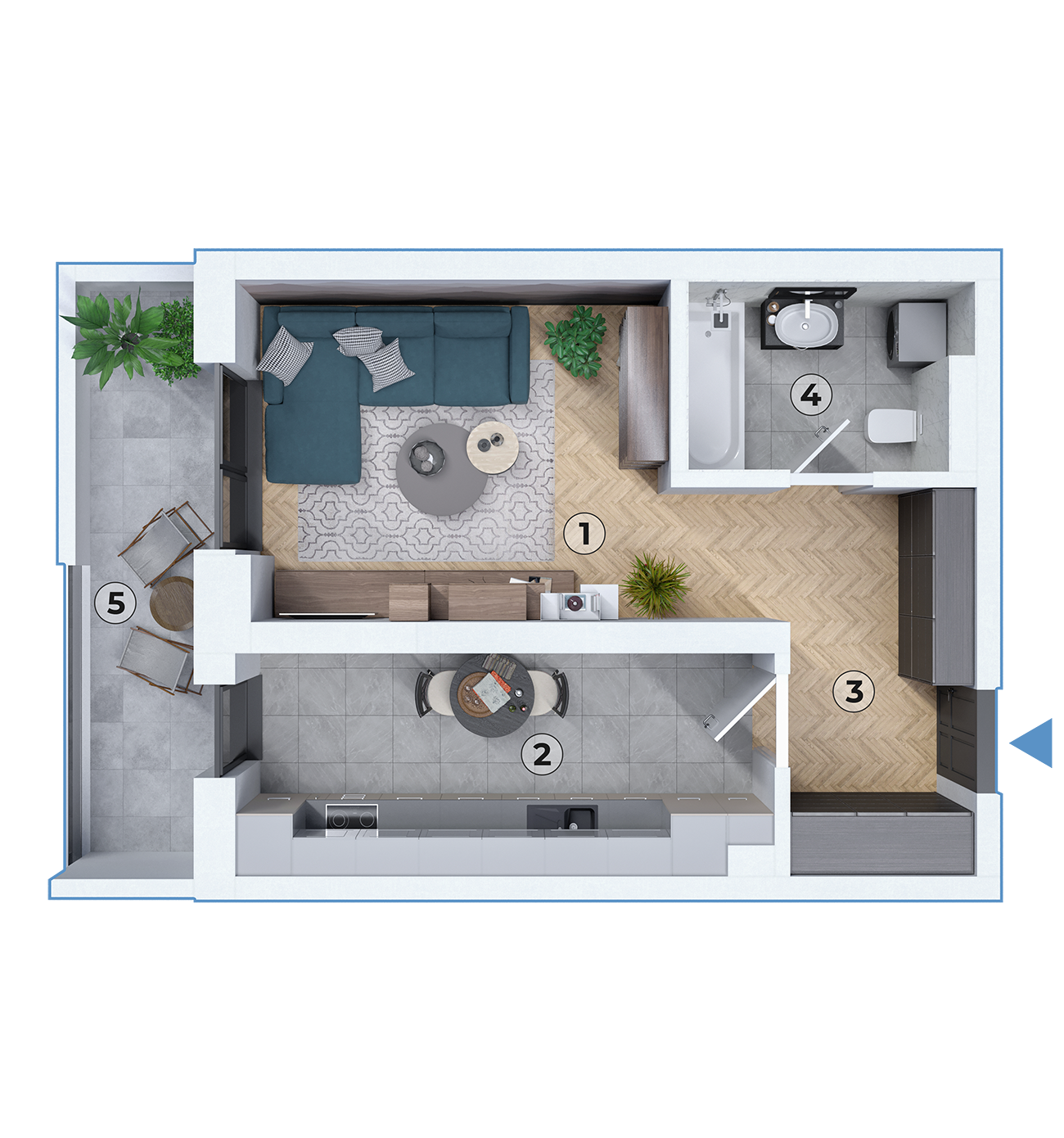 Holul de 3.87 mp asigură o trecere fluidă între diferitele zone ale studioului. Baia de 4.91 mp este modernă și funcțională, optimizând spațiul disponibil.